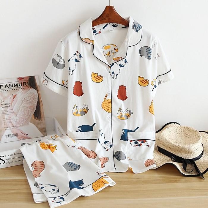 2020夏新作 レディース ねこ柄 パイピング パジャマ 綿100 半袖 上下セット かわいい 夏用 ハーフパンツ 寝間着 Women S Cat Cotton Pj ナイトウェア Aucppj708 Kikiファッション 通販 Yahoo ショッピング
