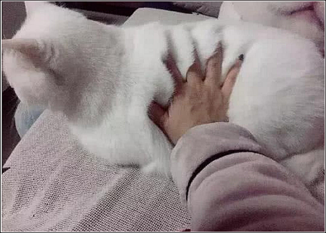 女子撸猫时被咬了口 但发现没有疼痛感 打开手掌一