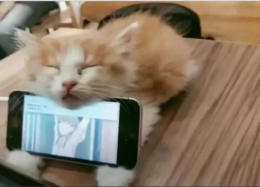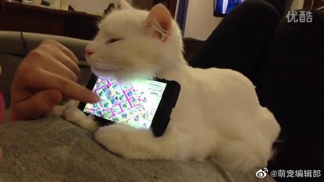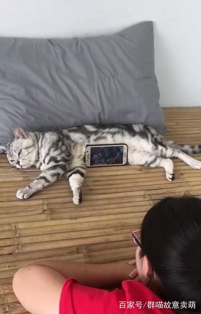一猫多用 猫咪给主人当手机支架 表情却不乐意为了小鱼干忍了