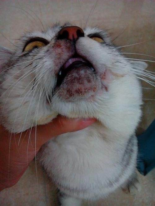 猫下巴有小黑点 今天下午回来看见猫下巴出血了 想问问是毛囊炎还是磕坏的
