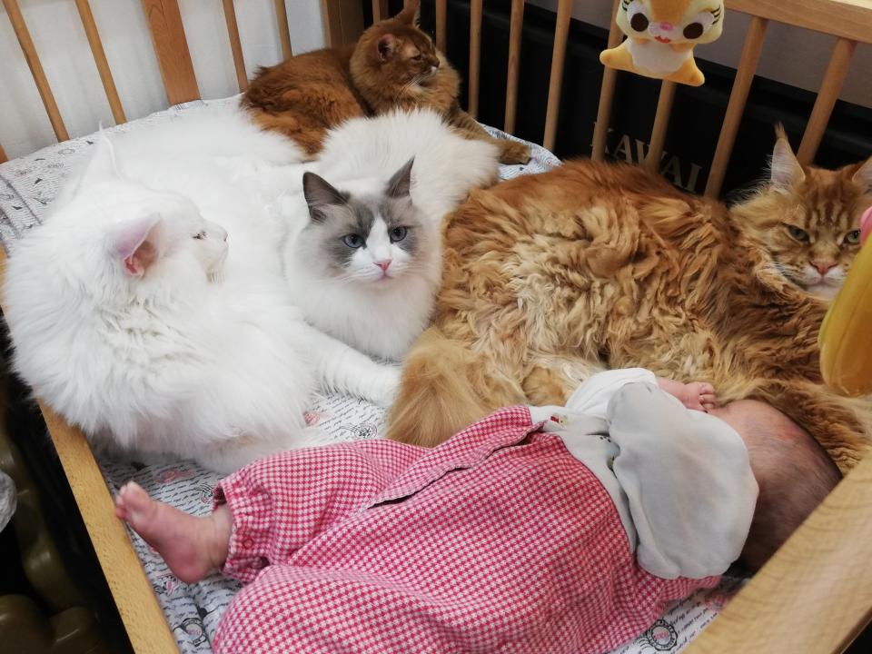 あふれ出る貫禄に 四天王感 赤ちゃんを見守る4匹のネコが頼もしい ニコニコニュース