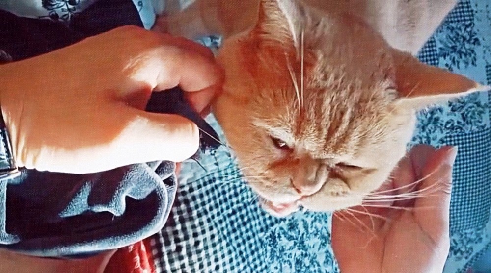 补衣服找不到剪刀裁线 橘猫张嘴就是一口 老妈都看傻了