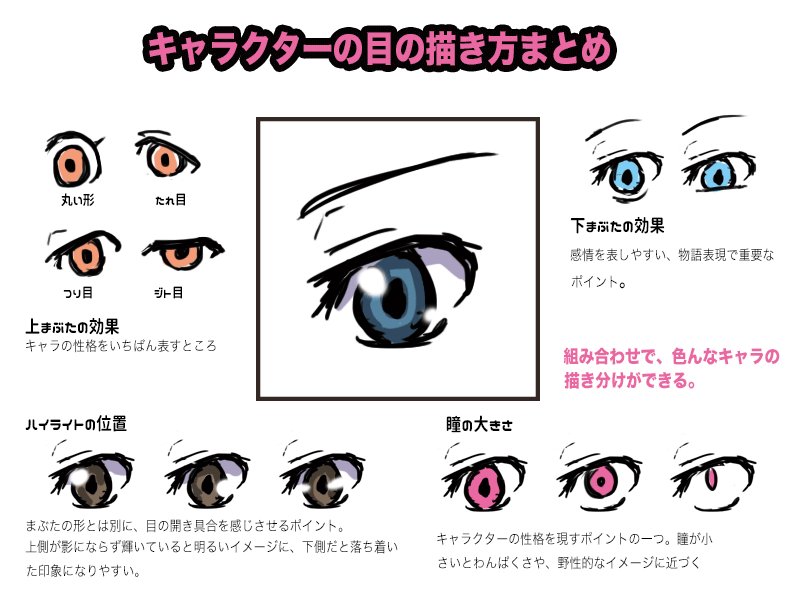 絵師ぺディア V Twitter 色々な目の描き方です 目は次の4つで大きく印象が変わります 瞳の大きさ ハイライトの位置 上まぶた 下まぶた 描こうとしているキャラはワイルドな感じか 落ち着いたキャラか 特徴に合わせて描き分けましょう Https T Co